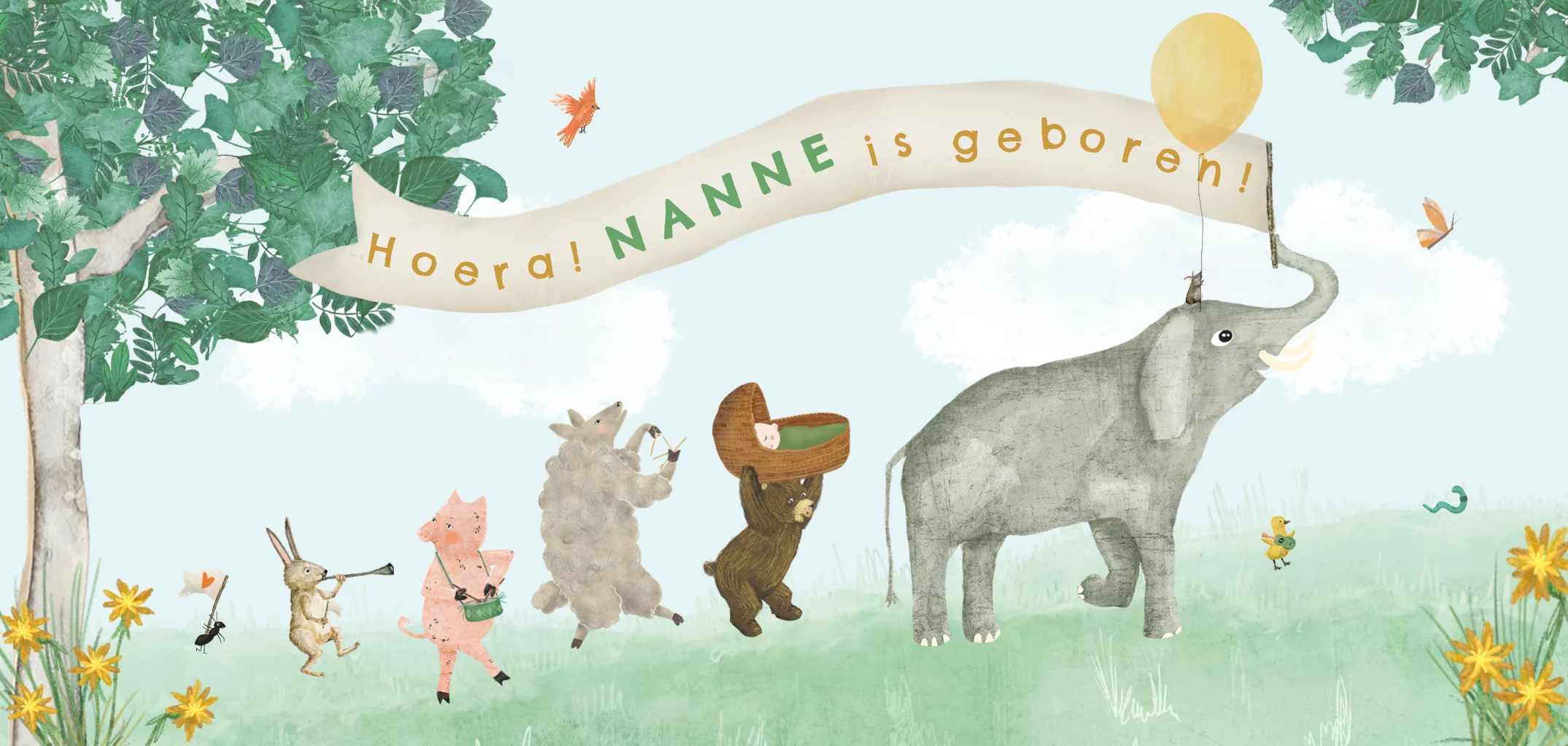 Geboortekaartje Nanne met een optocht van dieren in de zomer. Vrolijk en feestelijk geboortekaartje met dierenparade en een spandoek met de naam van je kindje. Ook als een herfst geboortekaartje te krijgen (zoek op Niene)