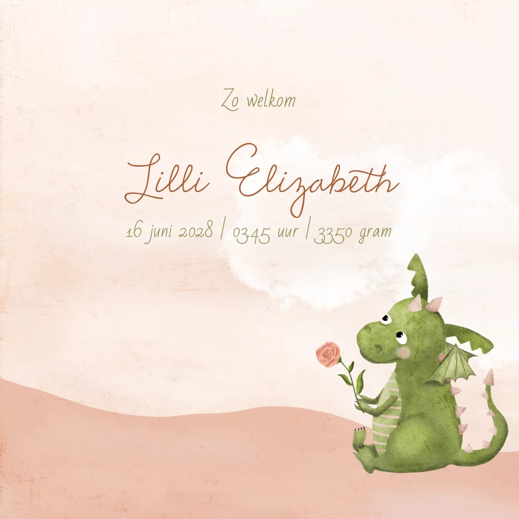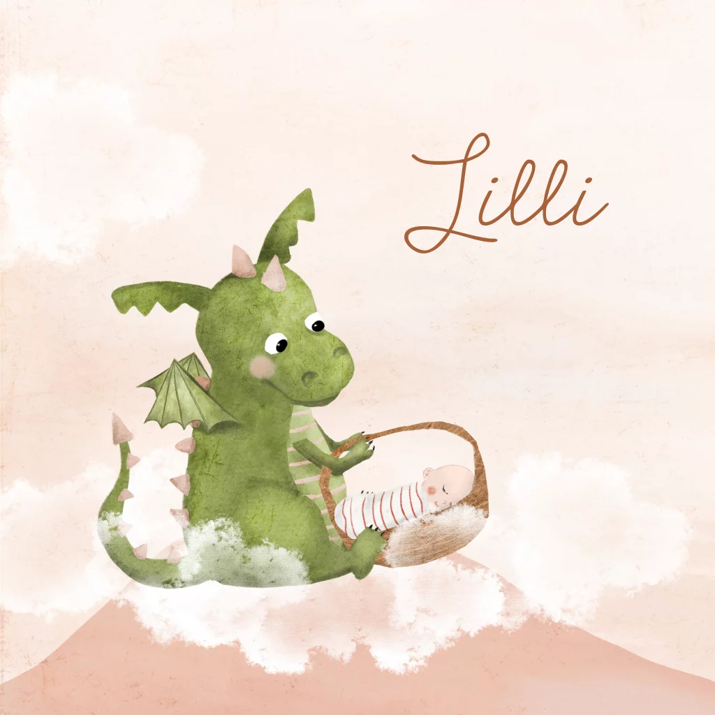 Geboortekaartje Lilli met een draakje die een babymandje vast heeft op de top van een berg in de roze lucht en wolken. Fantasy geboortekaartje met draak.