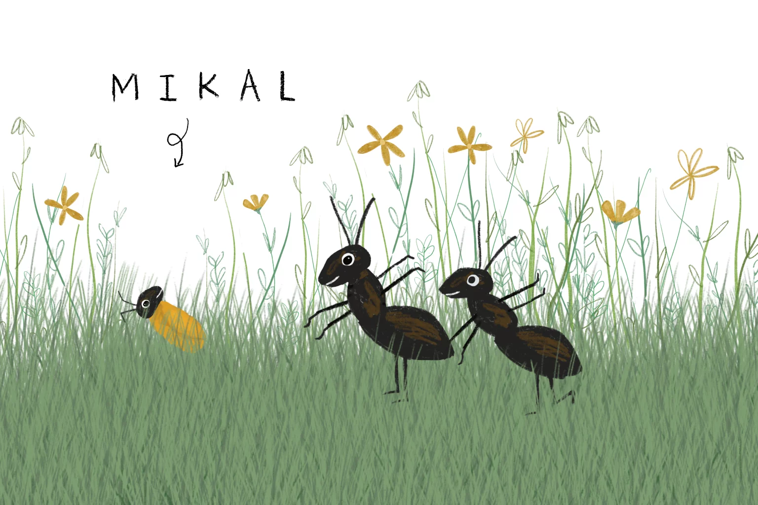 Geboortekaartje Mikal met de familie en baby mier in het hoge gras met boterbloemen. Je kunt het kaartje helemaal naar wens aanpassen!