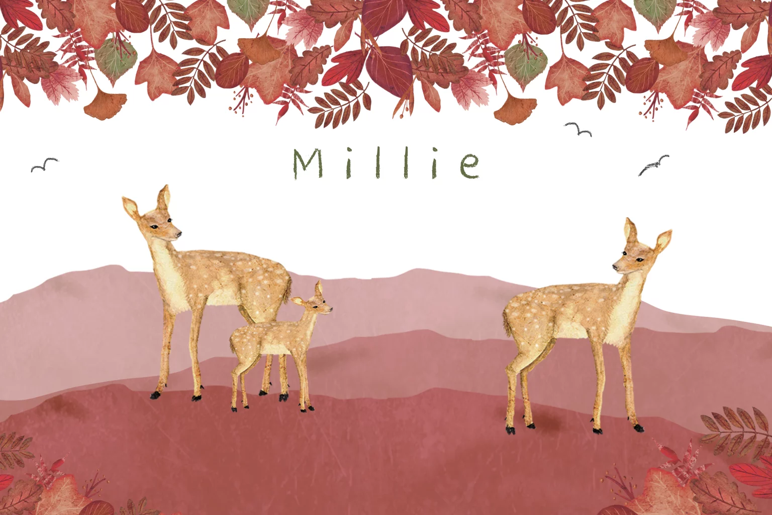 Geboortekaartje Millie met glooiend landschap in bordeaux rood en oud roze, met een familie hertjes en donkerrode herfstbladeren. Mooi voor een najaarskindje!