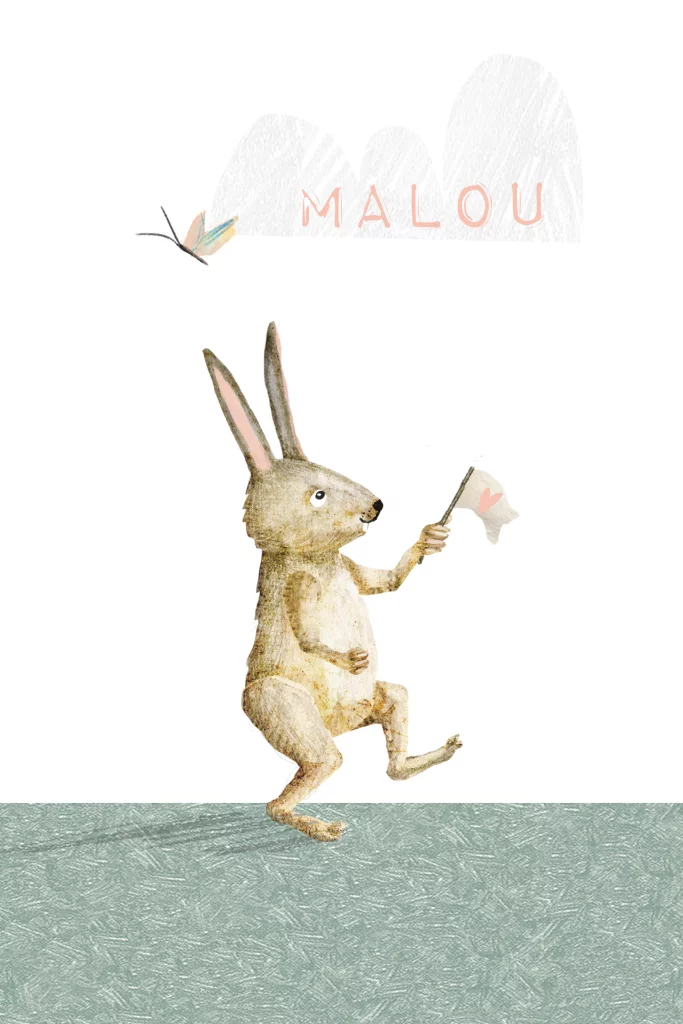In dit geboortekaartje Malou marcheert de haas met een vlag om jullie kleine meisje aan te kondigen. Schattig en toch stoer voor kleine meisjes en jongens!