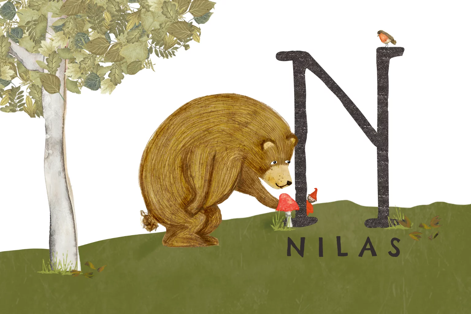 Geboortekaartje Nilas in het bos met grote letters, een beer die een kabouter ziet bij een rood met witte paddestoel.