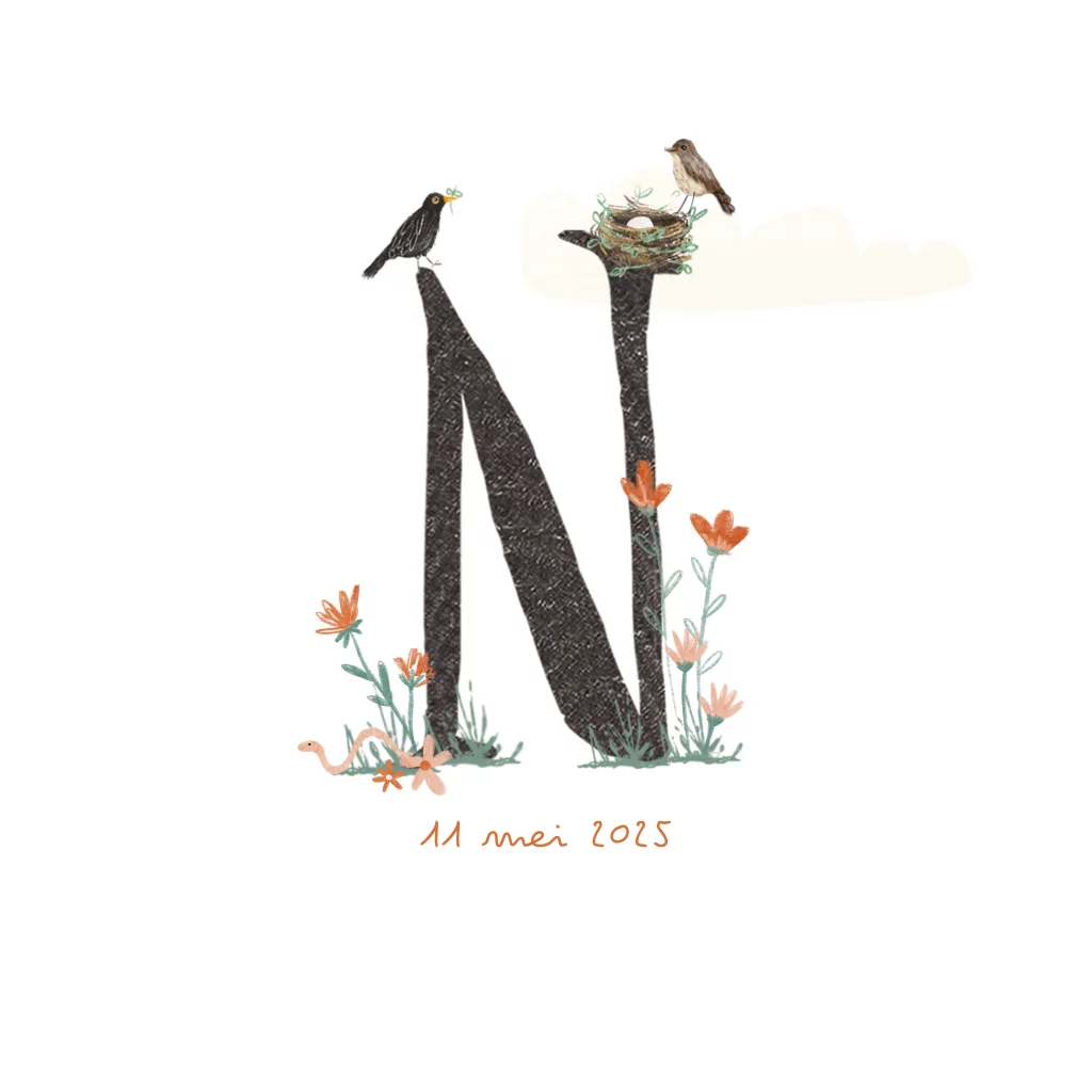 Lente geboortekaartje Nira met grote letter als initiaal en merel familie. Het eitje ligt in het nest en op de achterzijde is de baby vogel geboren. Je vindt de letters in de beeldbank zodat je zelf dit ontwerp af kunt maken.