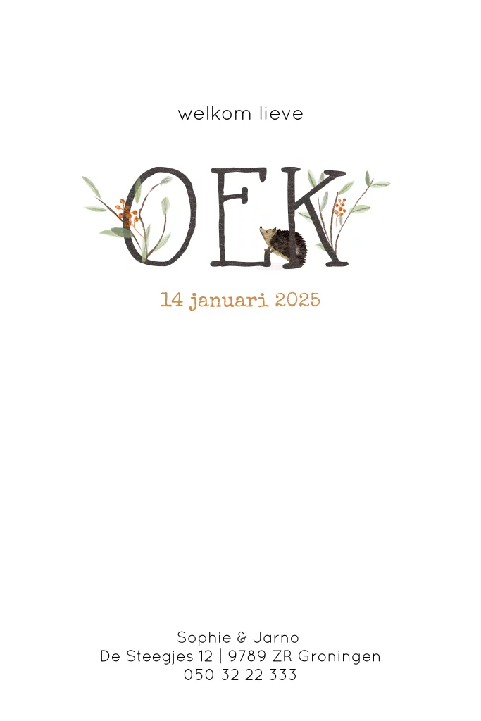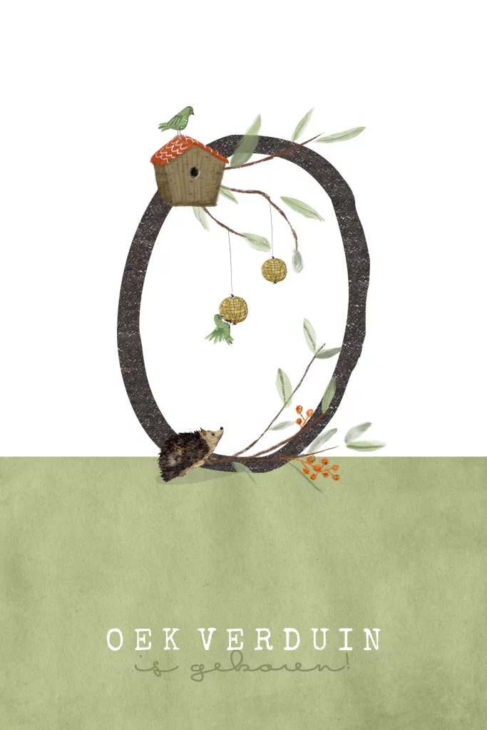 Lief geboortekaartje Oek met een initiaal op de voorkant versierd met blaadjes, takje en vogelvoerbolletjes. Er staat een nieuwsgierig egeltje te kijken en er fladderen groen vogeltjes omheen.