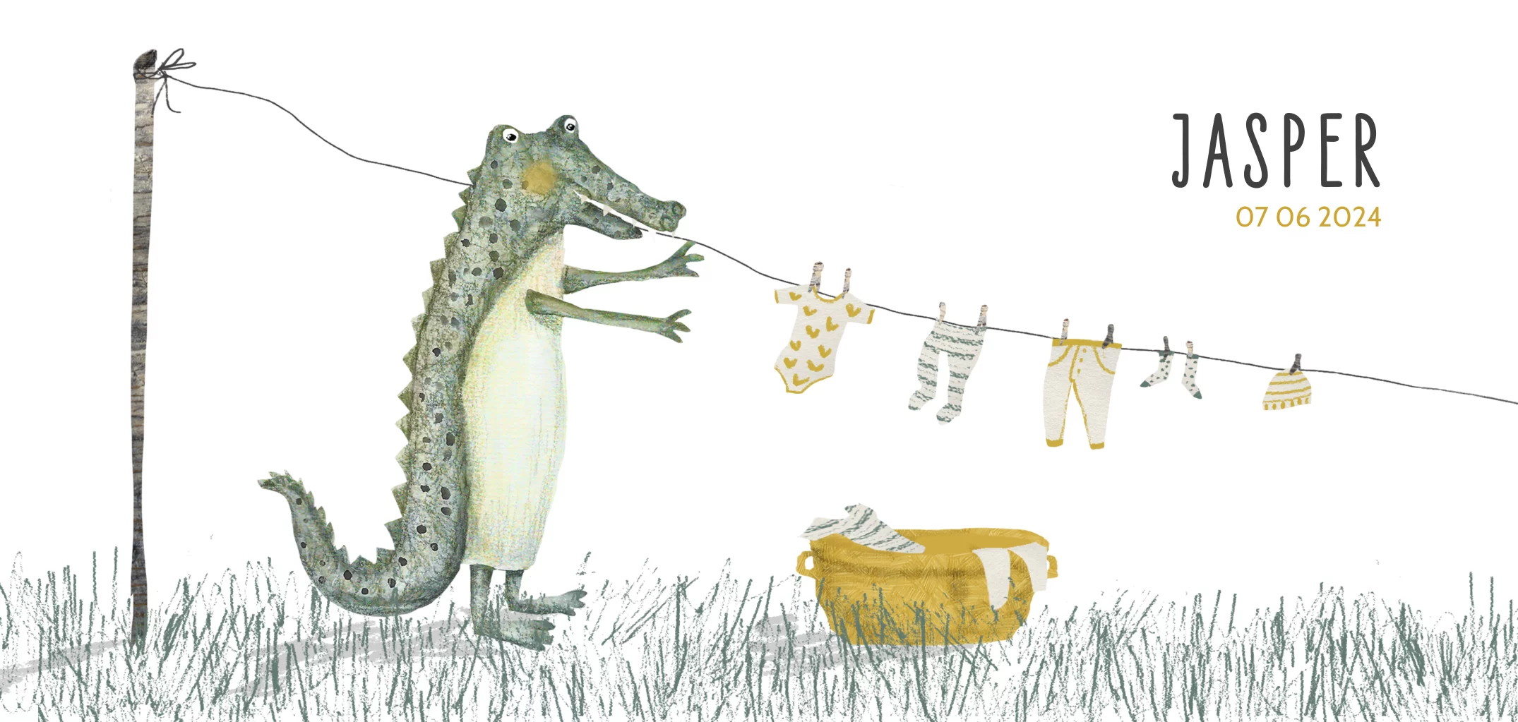 Schattige geboortekaartje Jasper met krokodil die de okergele babykleertjes aan de waslijn hangt. Pas de teksten en lettertypes gemakkelijk zelf aan.