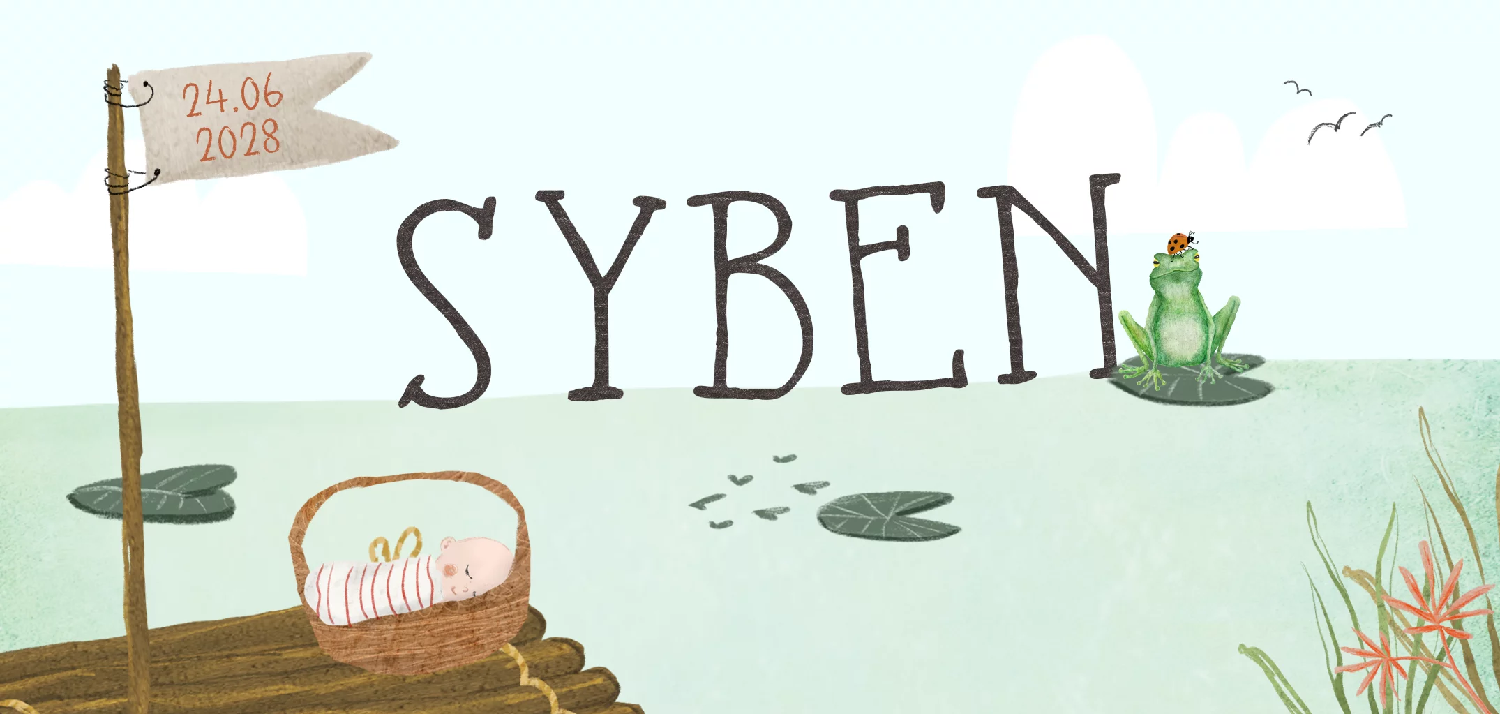 Geboortekaartje Syben, met grote letters en tekening van vlot in vijver en kikker met een lieveheersbeestje.