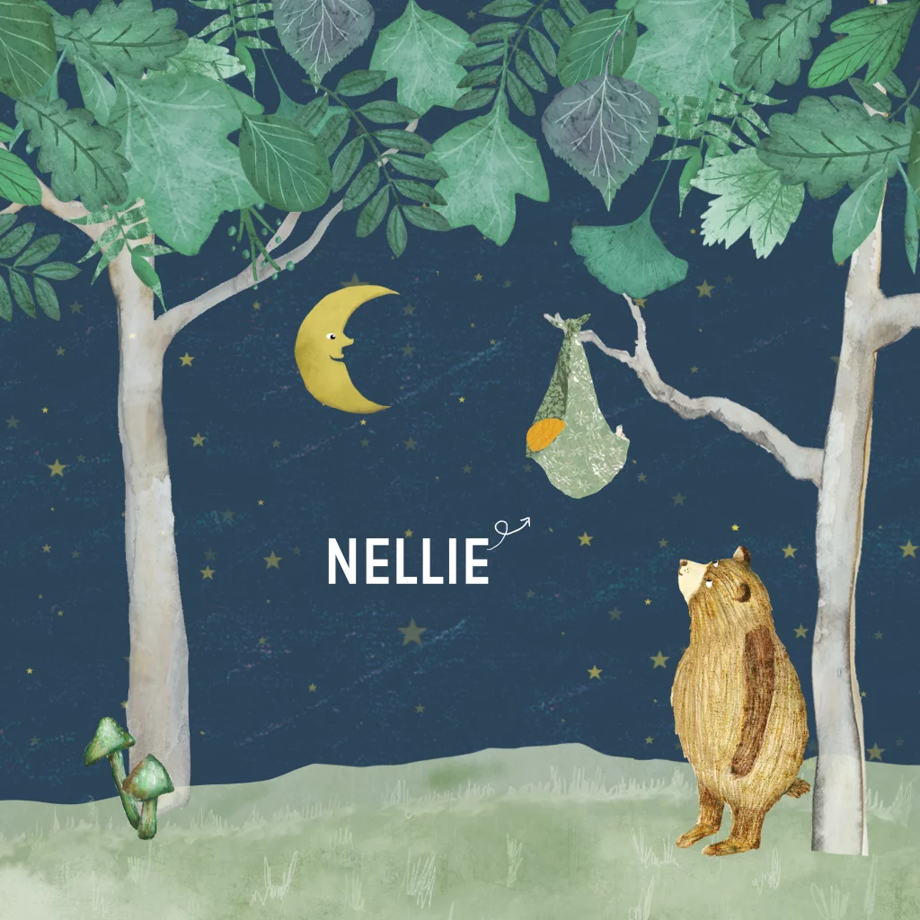 Lief geboortekaartje Nellie met groene blaadjes en de sterrenhemel. Op de voorkant is de baby net gebracht, beer is nieuwsgierig en neemt een kijkje.