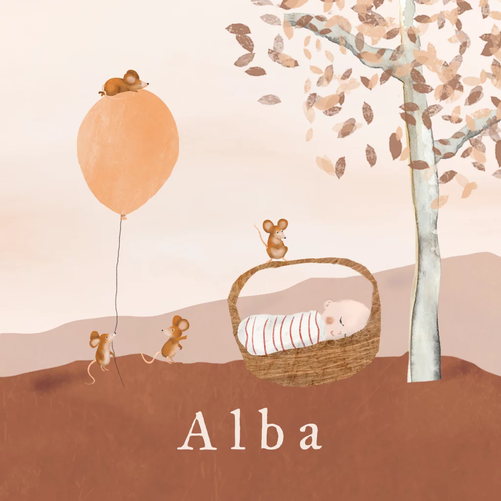 Getekend geboortekaartje met muisjes en baby in mandje met een ballon en herfstbladeren. in warme kleuren.