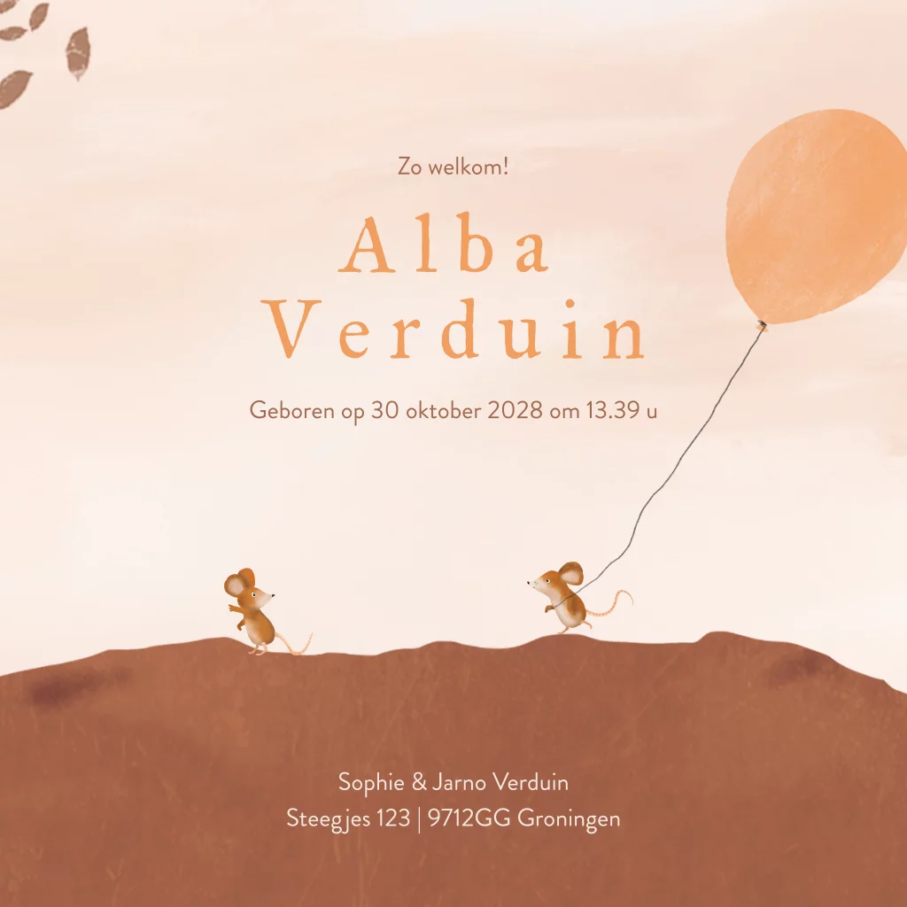 Lief geboortekaartje met muisjes in de herfst dat je gemakkelijk zelf kunt aanpassen.