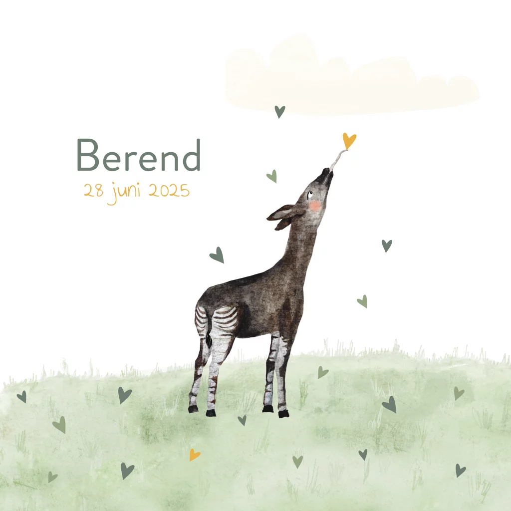 Lief geboortekaartje met okapi in het groen met heel veel hartjes. Je kunt eenvoudig de kleuren aanpassen.