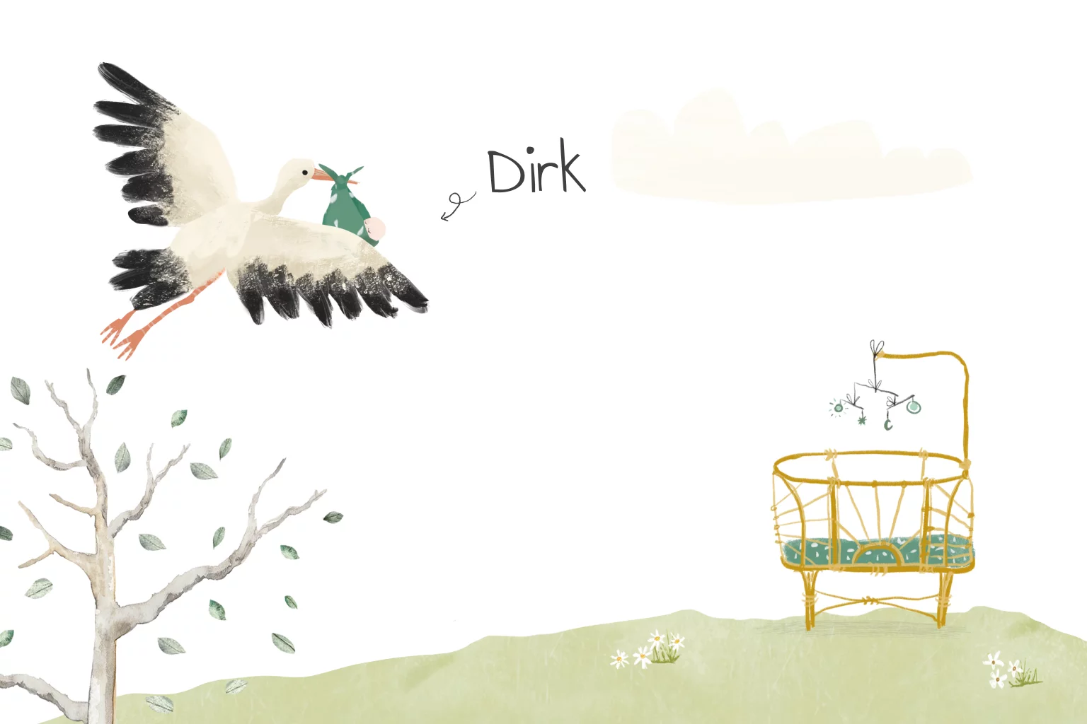In dit geboortekaartje Dirk brengt de ooievaar een baby en legt m in het rotan wiegje. Mooi met groen voor jongens en meisjes.