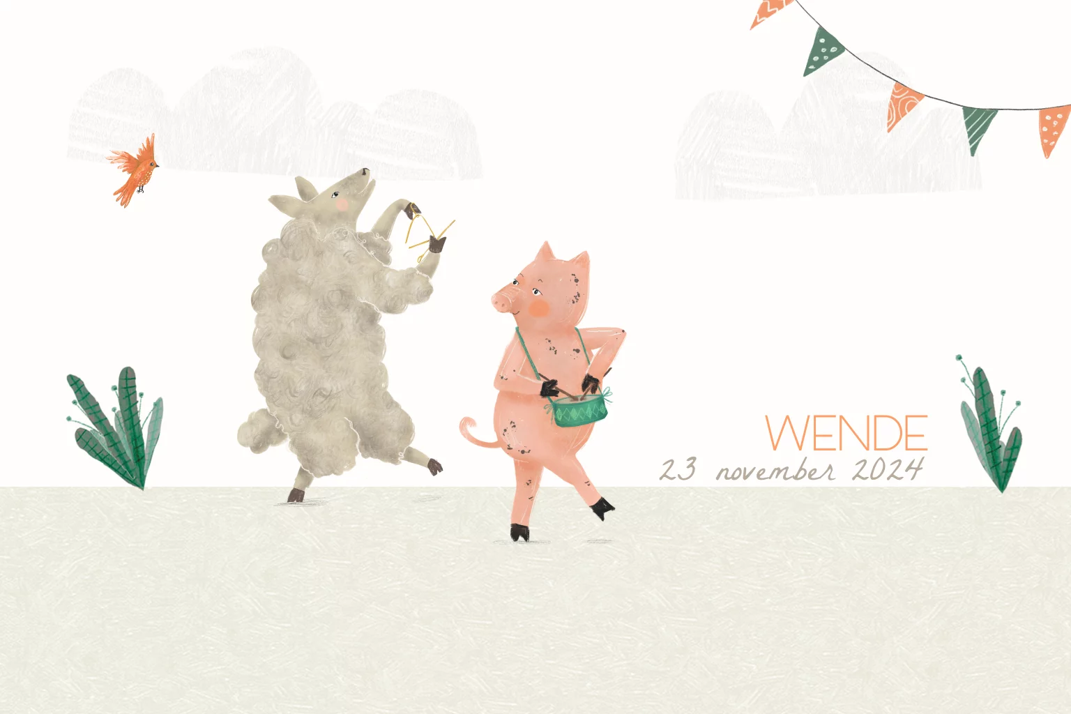 In dit grappige geboortekaartje Wende houden schaap en varken een optocht met zijn tweeën. De een met een trommel en de andere met een triangel.