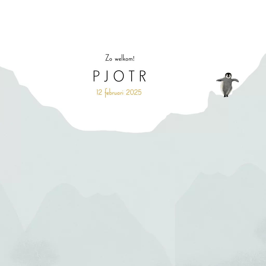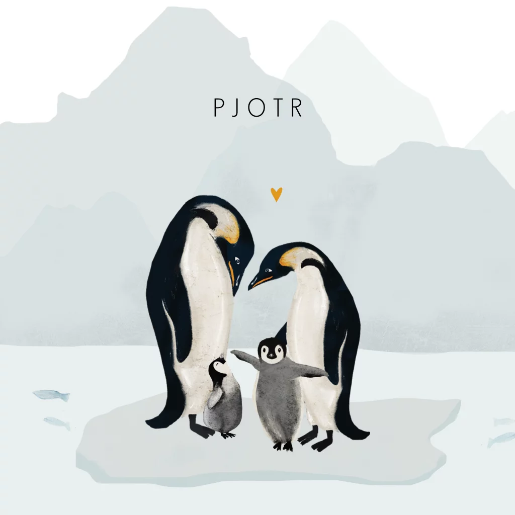Lief geboortekaartje Pjotr met gezin van pinguïns. De baby staat met zijn broertje of zusje tussen hun ouders.
