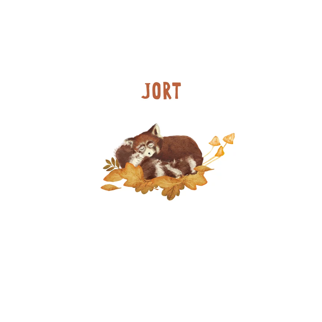 Lief geboortekaartje Jort met een slapende rode panda in een bedje van herfstblaadjes. Leuk met ronde hoeken!