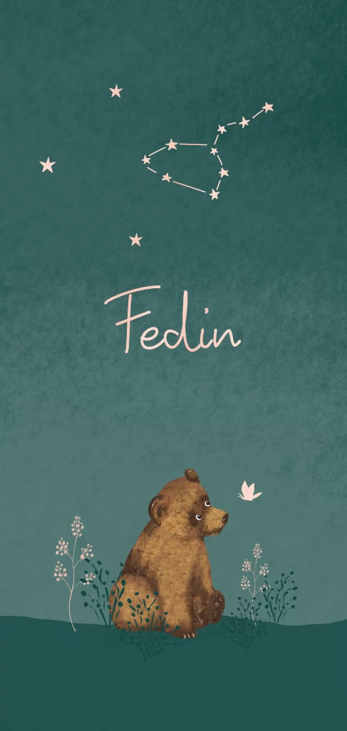Geboortekaartje Fedin met een sterrenbeeld en een tekening van een beertje met vlinder in hoogglans roze.