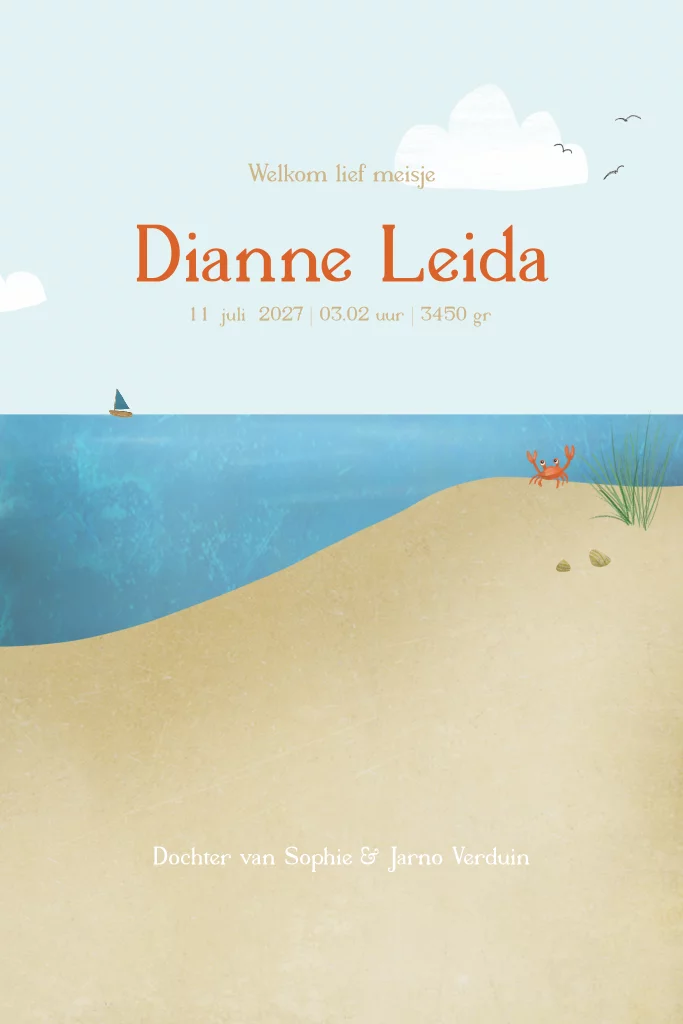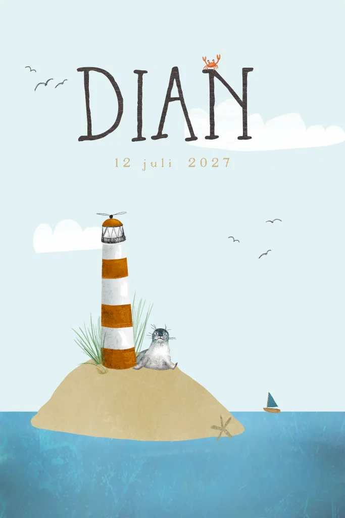 Geboortekaartje Dian met tekeningen van een zeehond, het strand, de zee en een vuurtoren. Je past dit kaartje gemakkelijk zelf aan. De losse letters laters in de beeldbank.