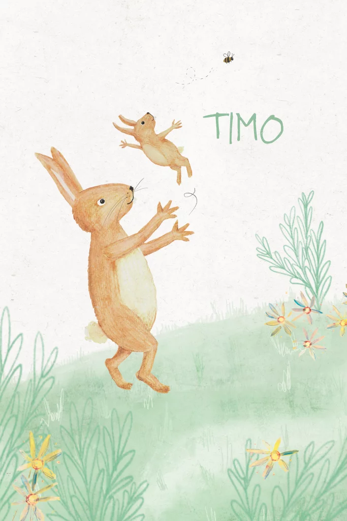 Getekend geboortekaartje Timo met een moeder haas die baby haasje speels in de lucht gooit. Lente geboortekaartje met lieve haasjes