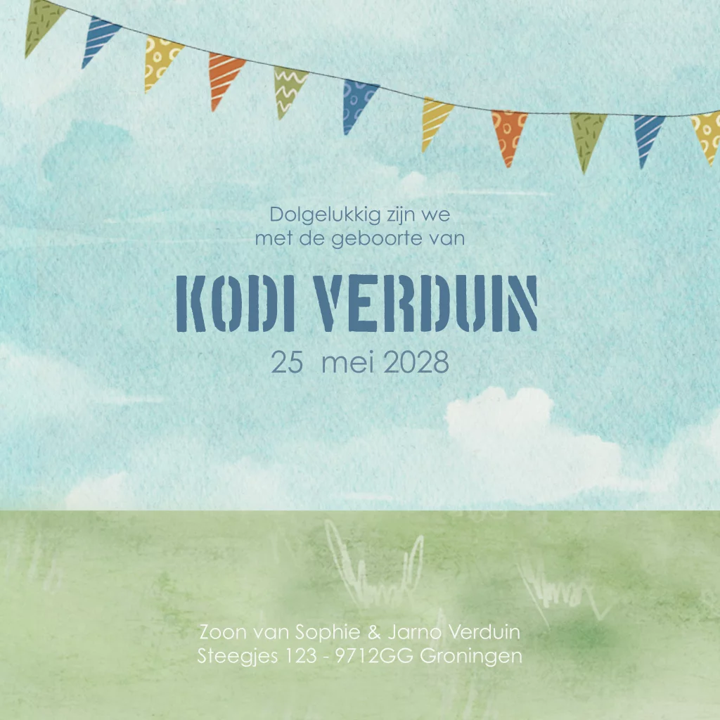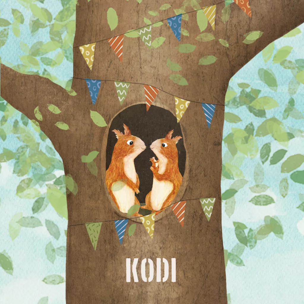 Geboortekaartje Kodi tekening van eekhoorntjes met baby in een holle boom. De boom is versierd met vlaggetjes en de blaadjes komen aan de bomen