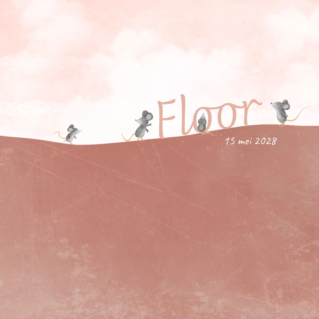 Geboortekaartje Floor met een roze lucht, en een tekening van een grijze muisjes die de naam zien en er met een touwladder op klimmen.