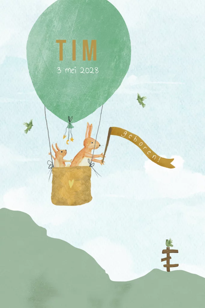 Geboortekaartje Tim met tekening twee haasjes in een luchtballon boven de bergen. Je kunt dit kaartje naar wens aanpassen.