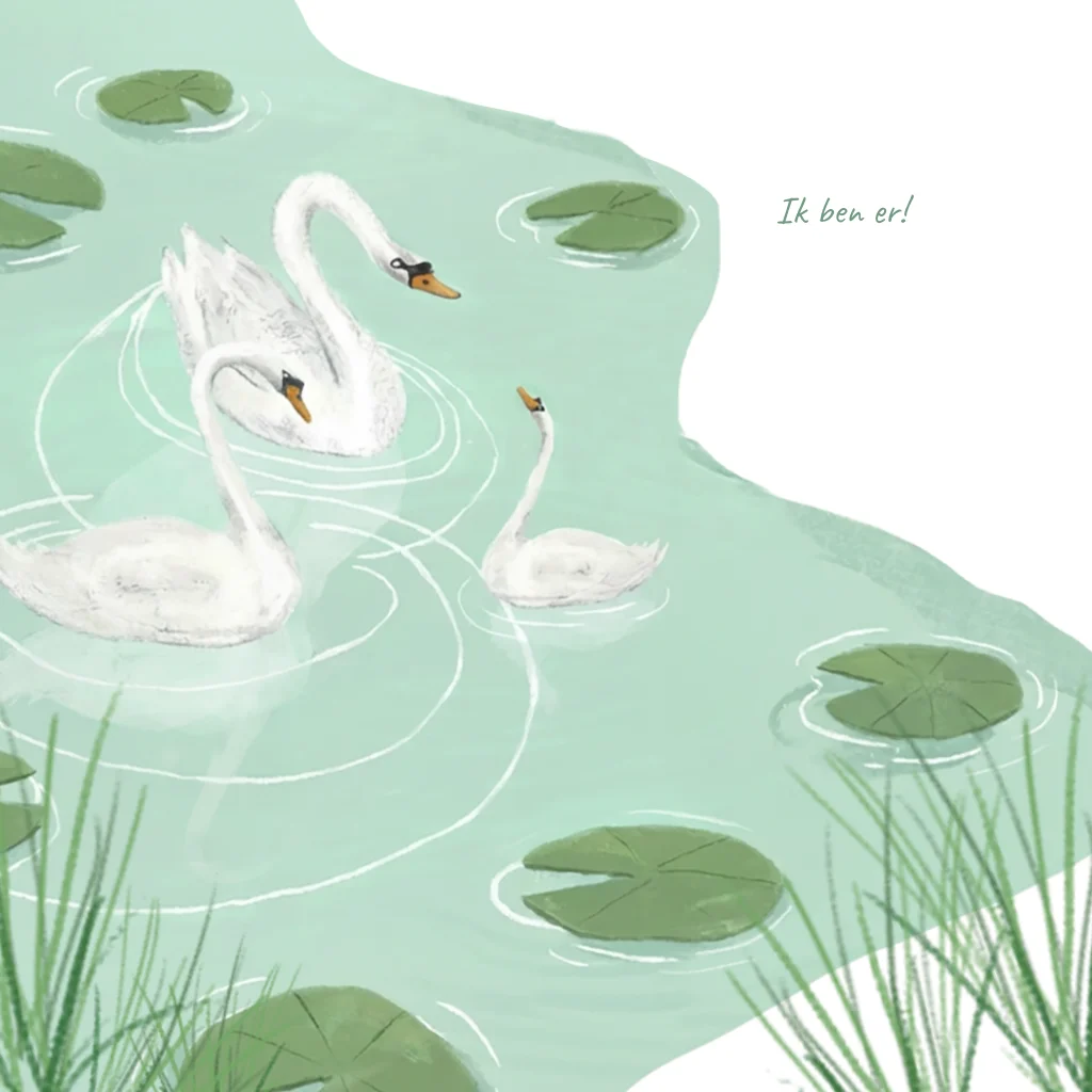Geboortekaartje tekening zwanen vijver