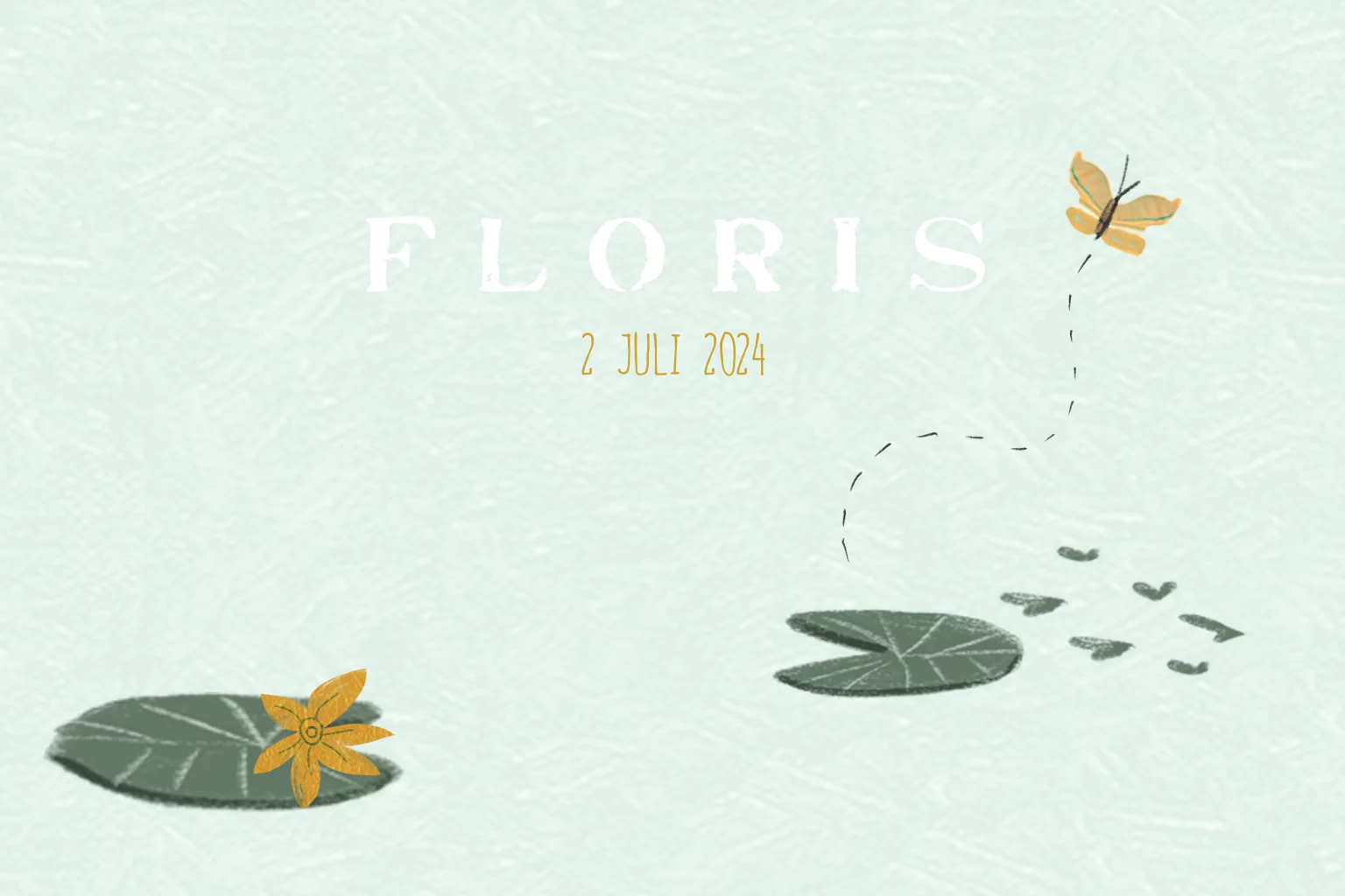 Dit eenvoudige zachte geboortekaartje Floris met leliebladeren en een vlindertje op een achtergrond ingekleurd met een mintgroen potlood.