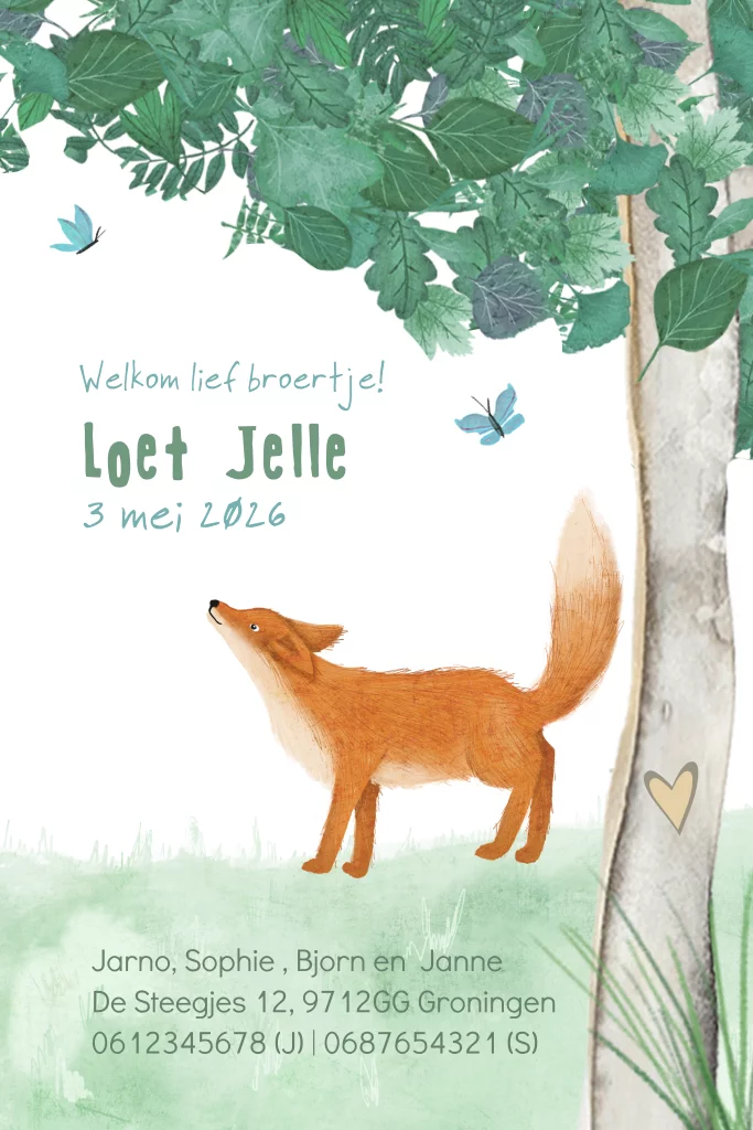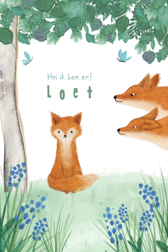 Gevouwen geboortekaartje met twee broertjes/zusjes vosjes die nieuwsgierig zijn naar de babyvos. Lief kaartje met veel groen en blauwe druifjes.