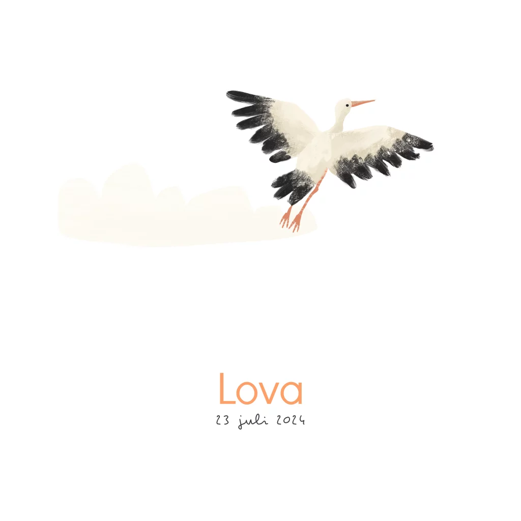 Eenvoudig geboortekaartje Lova met een handgetekende wegvliegende ooievaar. Op de achterkan zie je dat de ooievaar de baby in het rotan wiegje heeft gelegd.