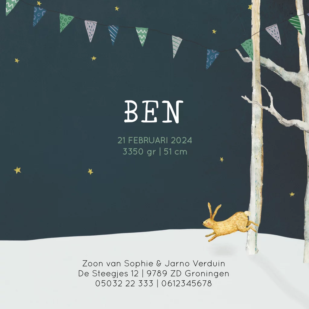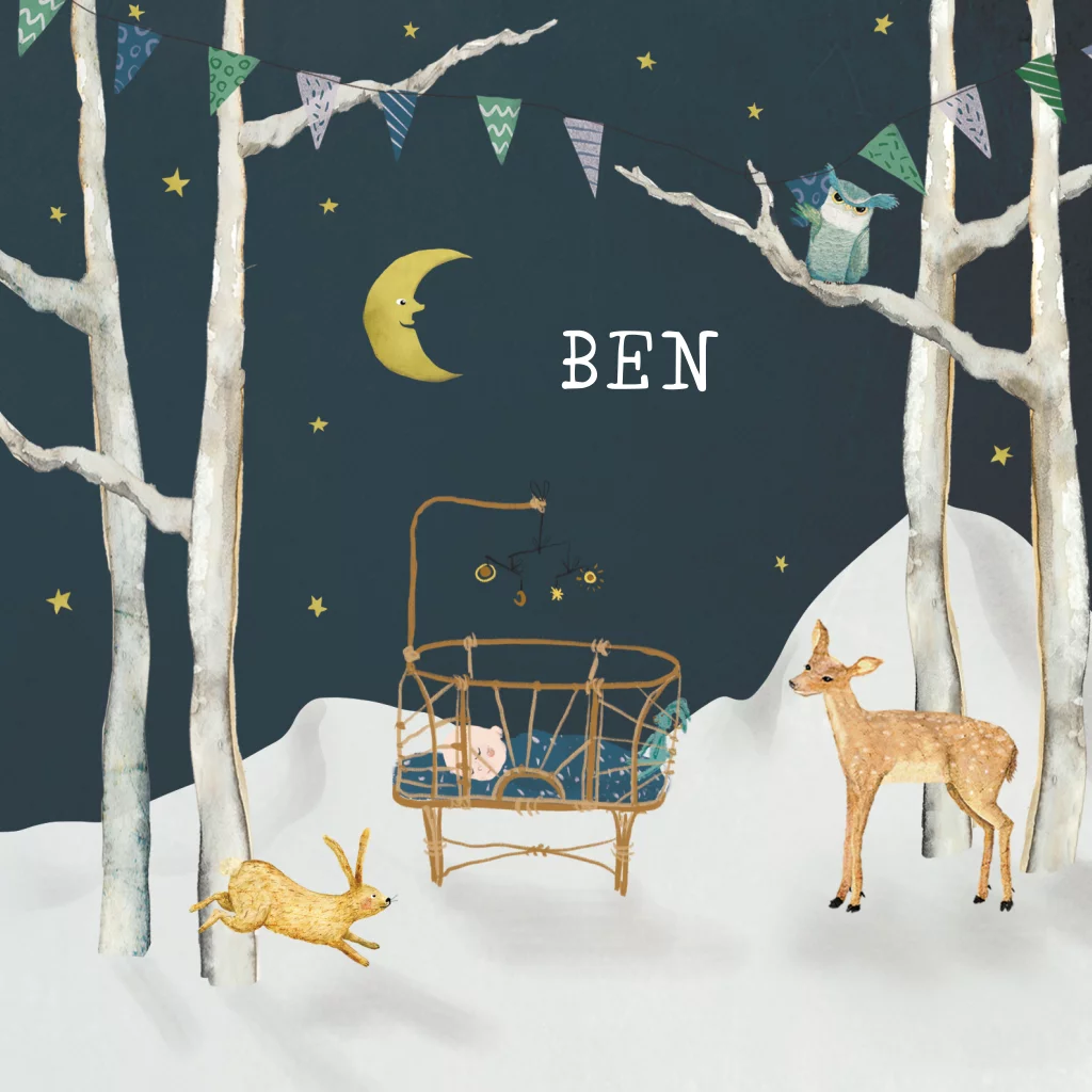 In dit winterse geboortekaartje Ben kijken het hertje en de haas nieuwsgierig naar het baby'tje in het rotan wiegje midden in het bos in de sneeuw. Blauw met groene details.