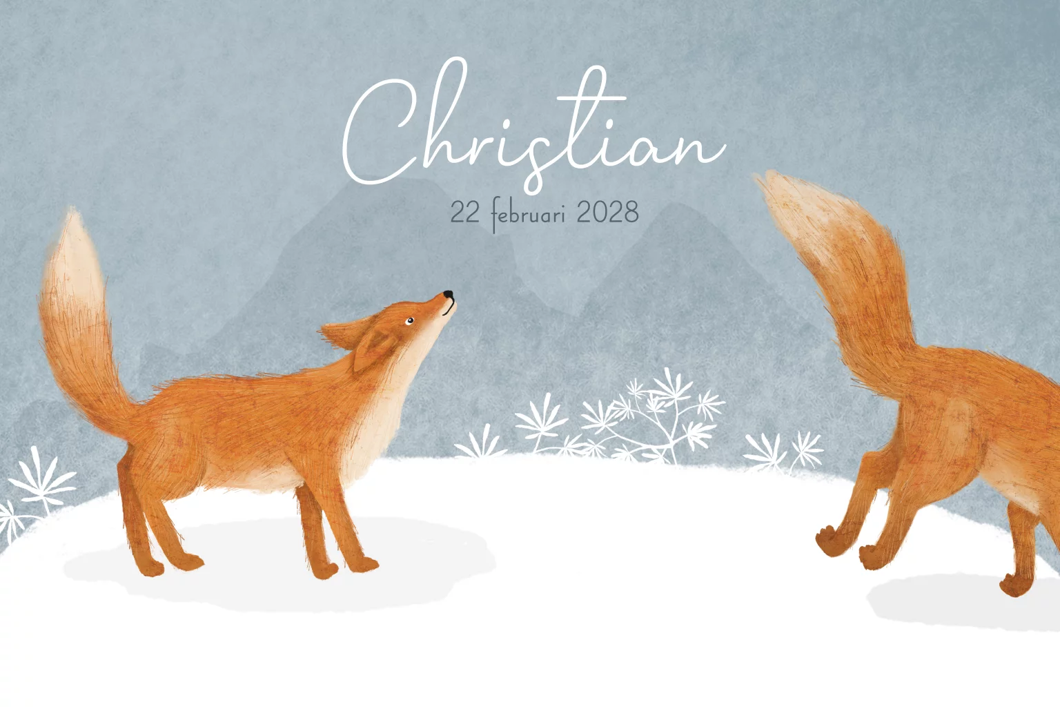Winter geboortekaartje Christian met vosjes in de sneeuw op lavendelblauwe achtergrond. Hulp nodig met je ontwerp? Stuur een vrijblijvend berichtje!