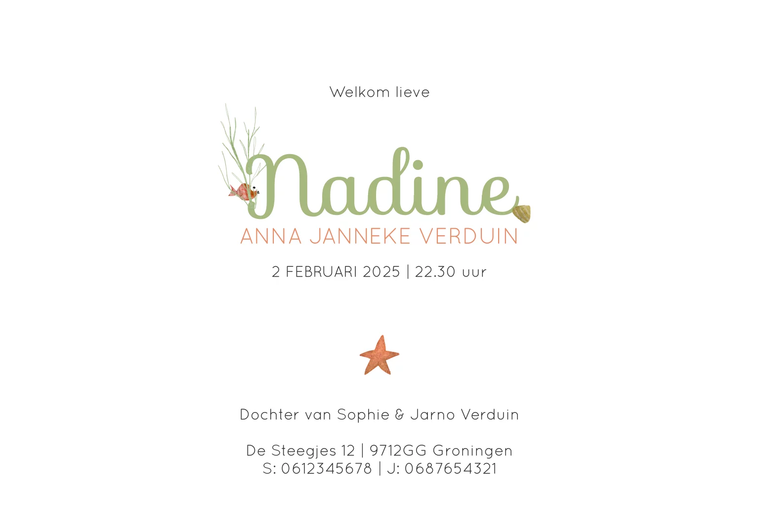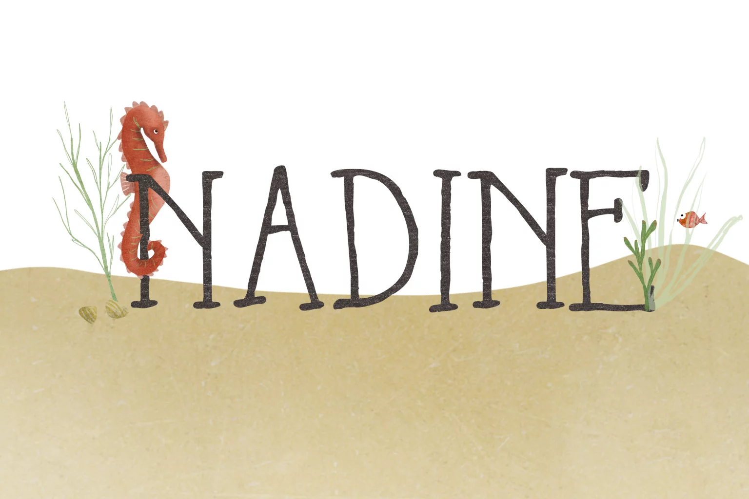 Lief geboortekaartje Nadine, met grote letters met zeepaardje, schelpjes en zeewier onderwater