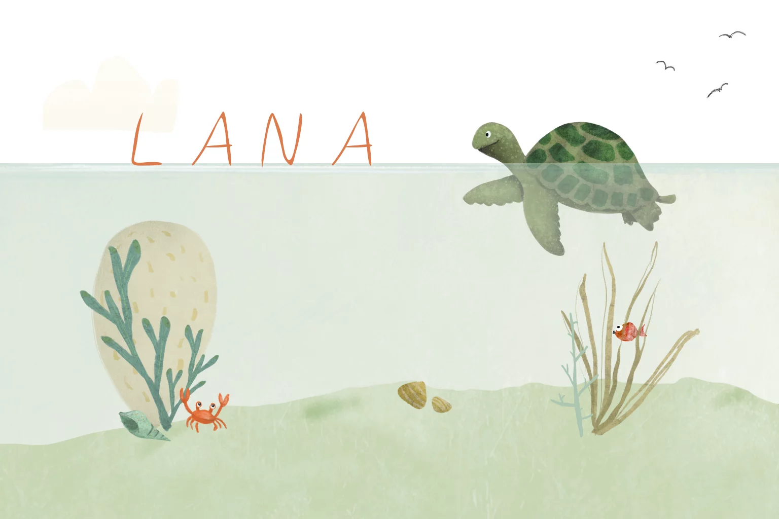Geschilderd geboortekaartje Lana onderwaterwereld met schildpad, juichende krab en mooie getekende waterplanten en koraal.