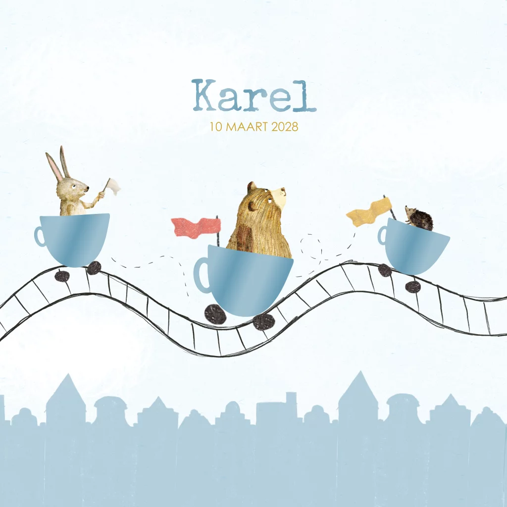 Getekend geboortekaartje Karel met bosdieren zoals de beer, egel en haas in een achtbaan in de lucht met skyline van grachtenpandjes.