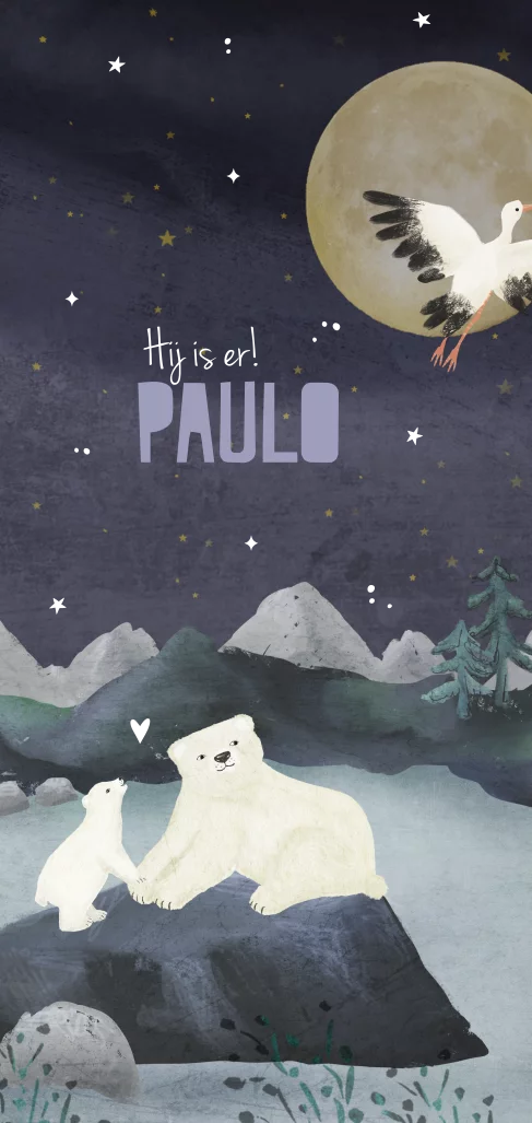 Geboortekaartje Paulo met tekening van ijsberen onder een mooie sterrenhemel van zilverfolie. Je past dit kaartje eenvoudig zelf aan.