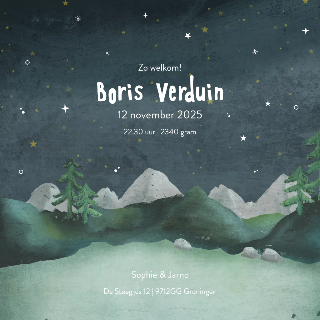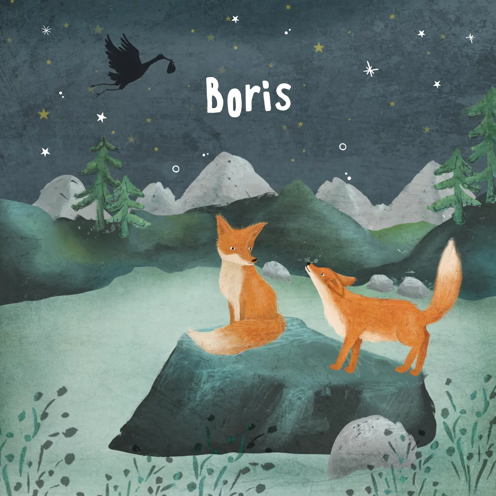Prachtig geboortekaartje met vosjes onder de sterrenhemel van goudfolie. Sfeervolle tekening van vossen in het bos bij een meer.
