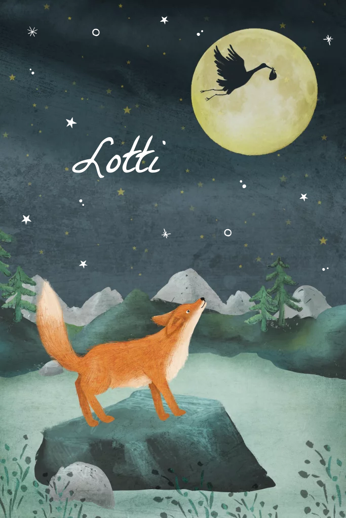 Sfeervol geboortekaartje Lotti met een tekening van vosjes in het bos, met bergen onder de sterrenhemel van goudfolie. De ooivaar vliegt langs de volle maan.