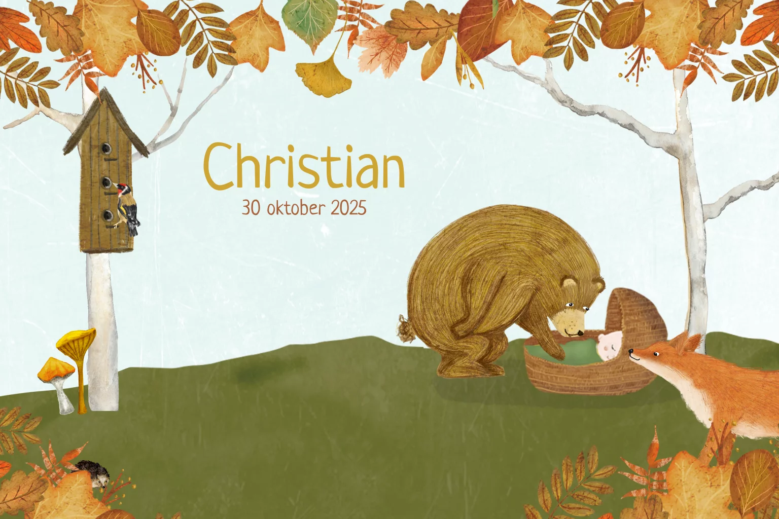 Lief herfst geboortekaartje Christian, met een beer die in een rieten wiegje met baby kijkt en een nieuwsgierig vosje en herfstblaadjes.