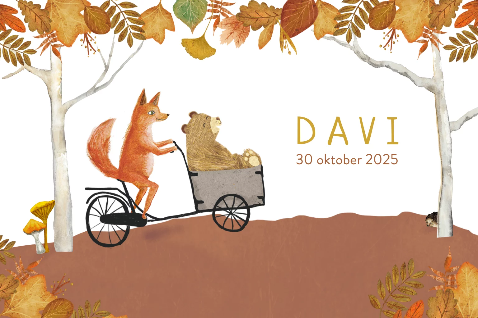 Grappig geboortekaartje met vos op de bakfiets. In zijn bak giert beer van het lachen. Ze fietsen door een herfstig bos op weg naar baby Davi.