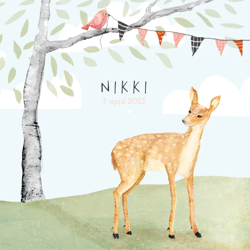 Lief geboortekaartje Nikki met een hertje en een vogeltje in een boom. Leuk voor lente en zomer baby's