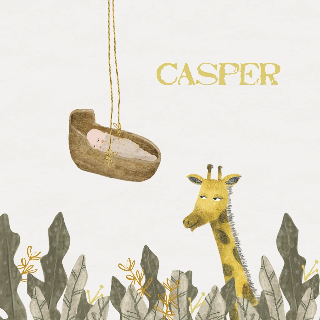 Grappig geboortekaartje Casper in de jungle met een tekening van een baby in een mandje en giraf en een aapje en mooie olijf groene kleuren. De losse takjes kun je eenvoudig van kleur veranderen of vervangen door iets anders.