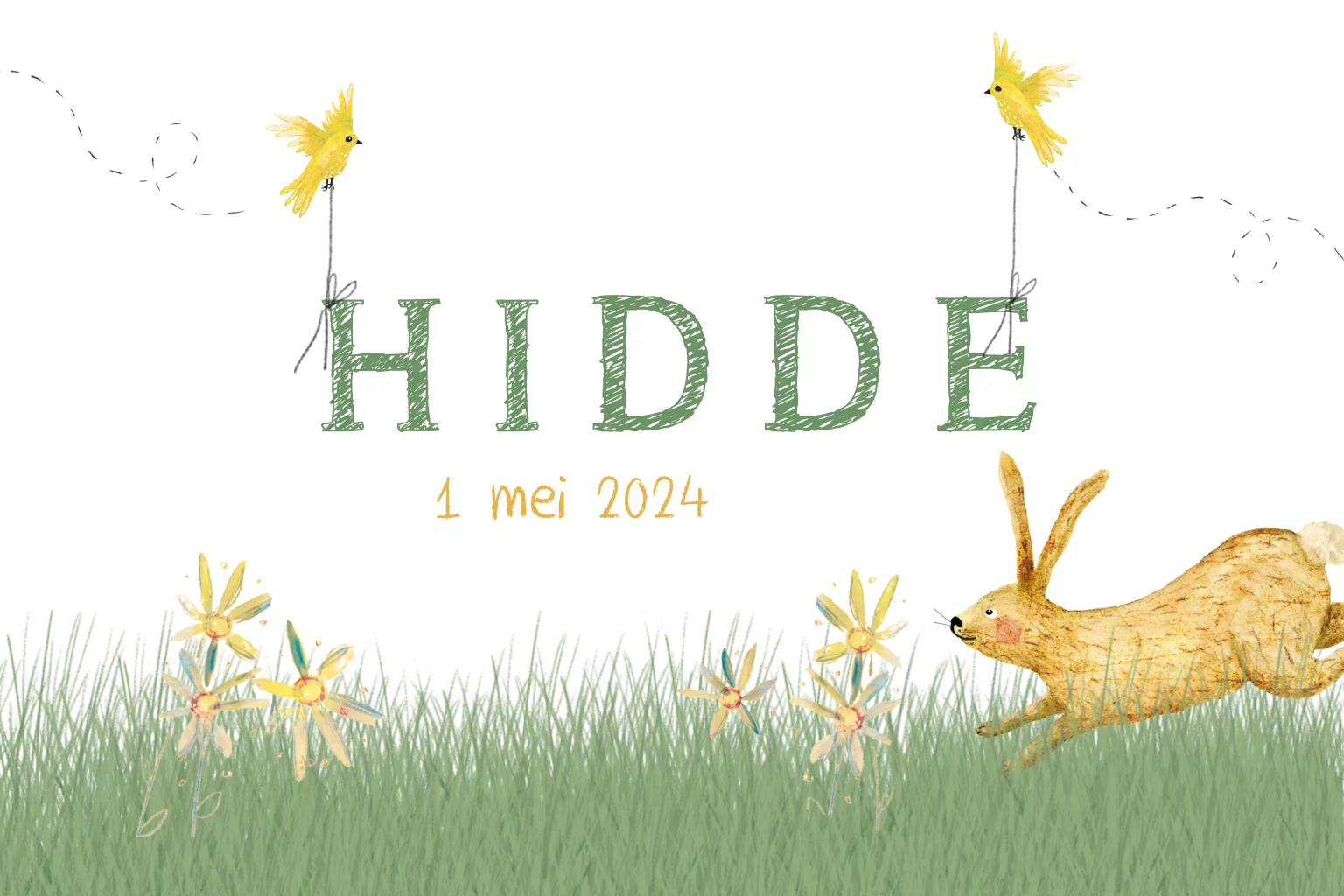 In dit frisse lente geboortekaartjes Hidde, brengen twee vogeltjes de naam en zit een lief konijntje in het hoge groene gras.