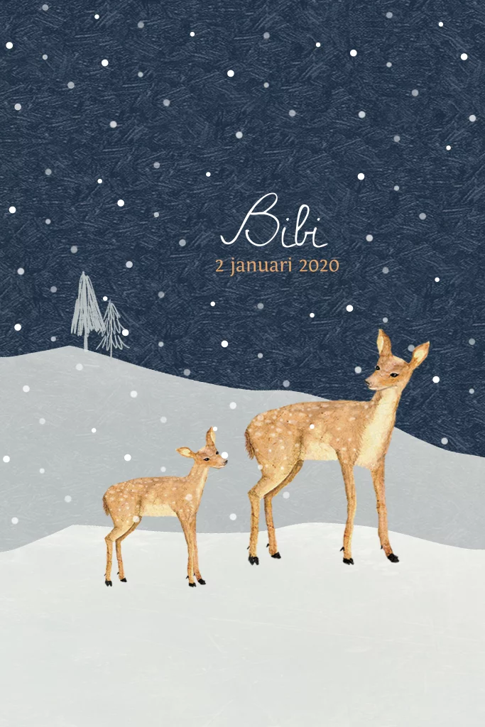 Lief winters geboortekaartje Bibi met een baby hertje in een winters landschap.