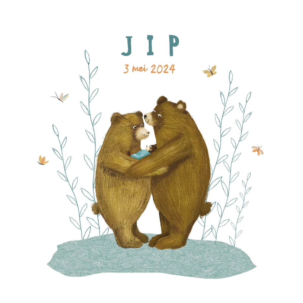 Lief geboortekaartje met vader en moeder beer met een babybeertje. Mooie vlindertjes fladderen rond.
