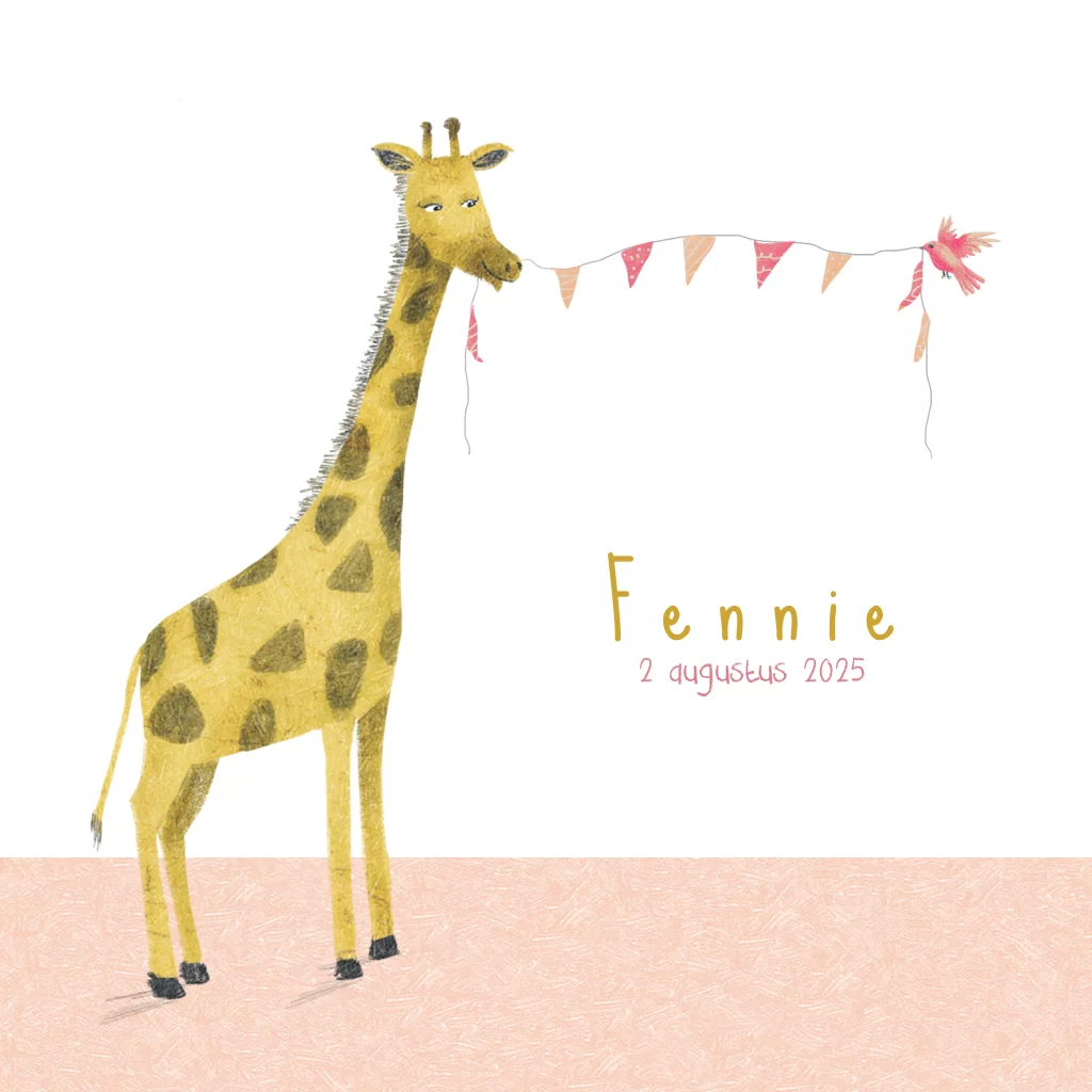 Lief geboortekaartje Fennie met een giraf die samen met een vogeltje een roze slinger gaat ophangen.