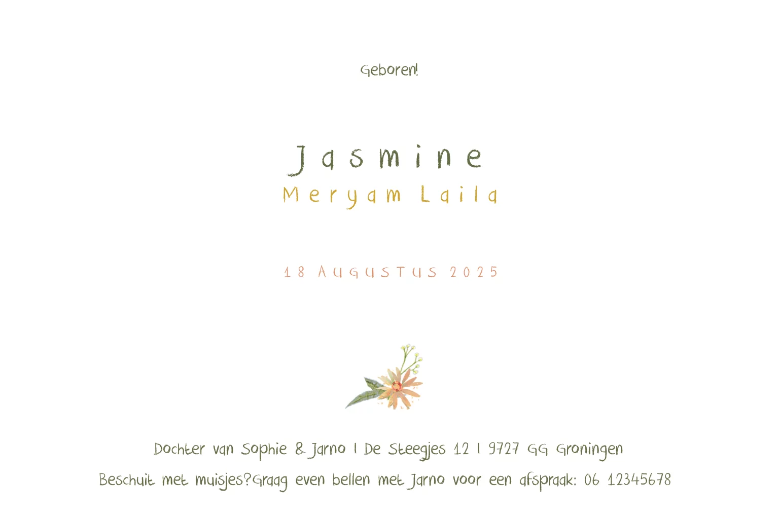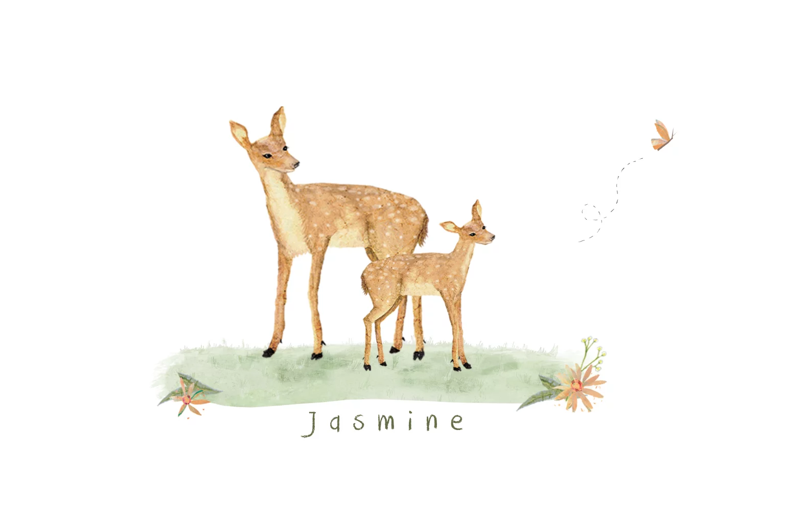 Lief geboortekaartje Jasmine met hertjes in een bloemenweide met mooie kleuren als oudroze, okergeel, roest en olijfgroen.