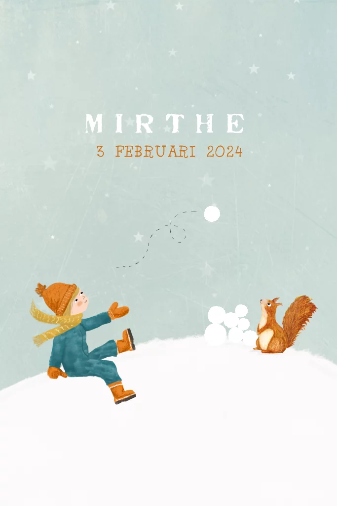 In dit schattige winterse geboortekaartje Mirthe speelt een kindje met een eekhoorntje. Ze gooien met sneeuwballen. Leuk kaartje als je een broertje of zusje verwacht!