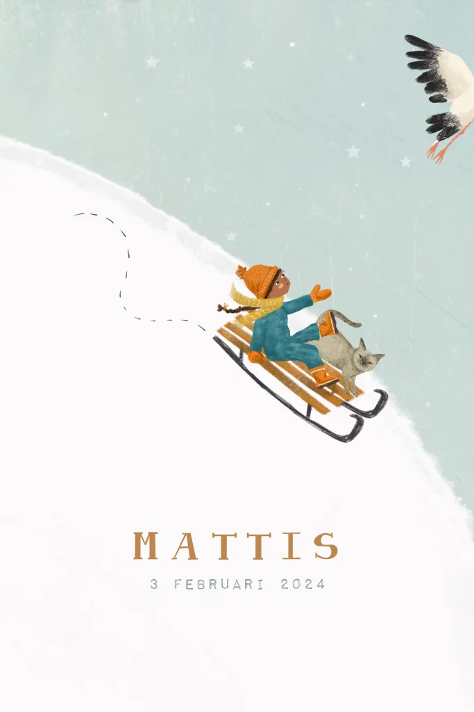 Op dit geboortekaartje Mattis ziet het meisje de ooievaar langs vliegen terwijl ze met haar poes de berg af sleet. Leuk kaartje als je een broertje of zusje verwacht!