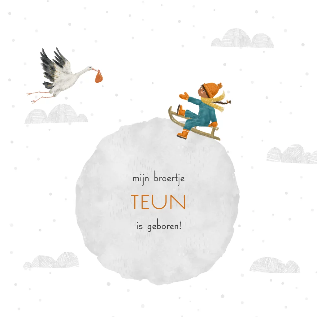 In dit schattige geboortekaartje Teun zit een meisje op een slee op de besneeuwde wereldbol en wijst naar een ooievaar die een zusje of broertje kunt brengen. Kijk in de beeldbank voor een jongetje/andere huidskleur en een andere kleur babybuidel bij vogels!