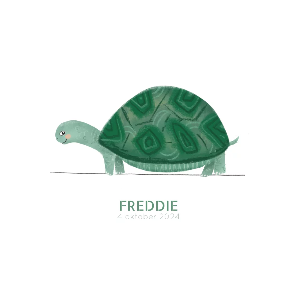 Een clean en minimalistisch geboortekaartje Freddie met schildpadje en mooie letters.