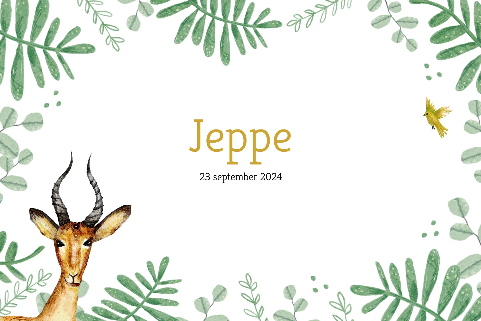 Rustig geboortekaartje voor jongen met groene junglebladeren, een handgetekende impala en mooie okergele vogeltjes.